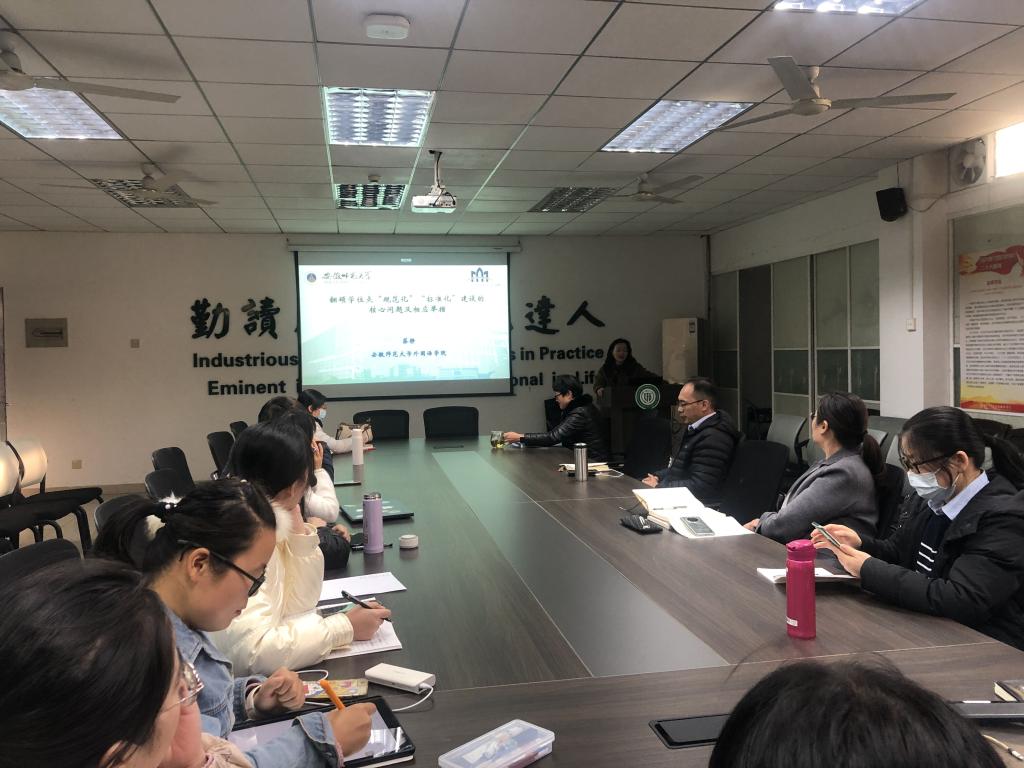 11月24日下午,安徽师范大学德赢Vwin官方区域合作伙伴副院长蔡静教授做客“狮子山导师学校”,以“翻硕学位点‘规范化’‘标准化’建设的核心问题及相应举措”为题作报告交流。德赢Vwin官方区域合作伙伴副院长秦发兰研究员主持讲座并致欢迎辞。